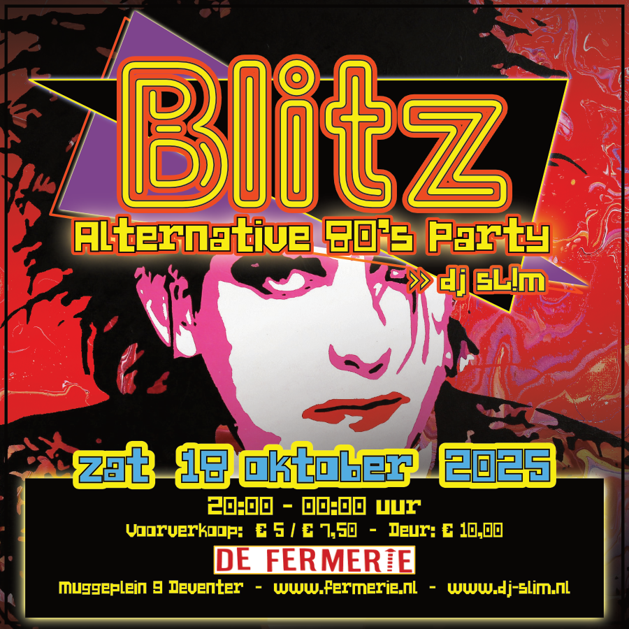Op de BLITZ Party in De Fermerie kun je van 20:00 tot 0:00 uur dansen op DJ sL!m’s unieke mix van jaren 80 alternatieve pop en new wave muziek.